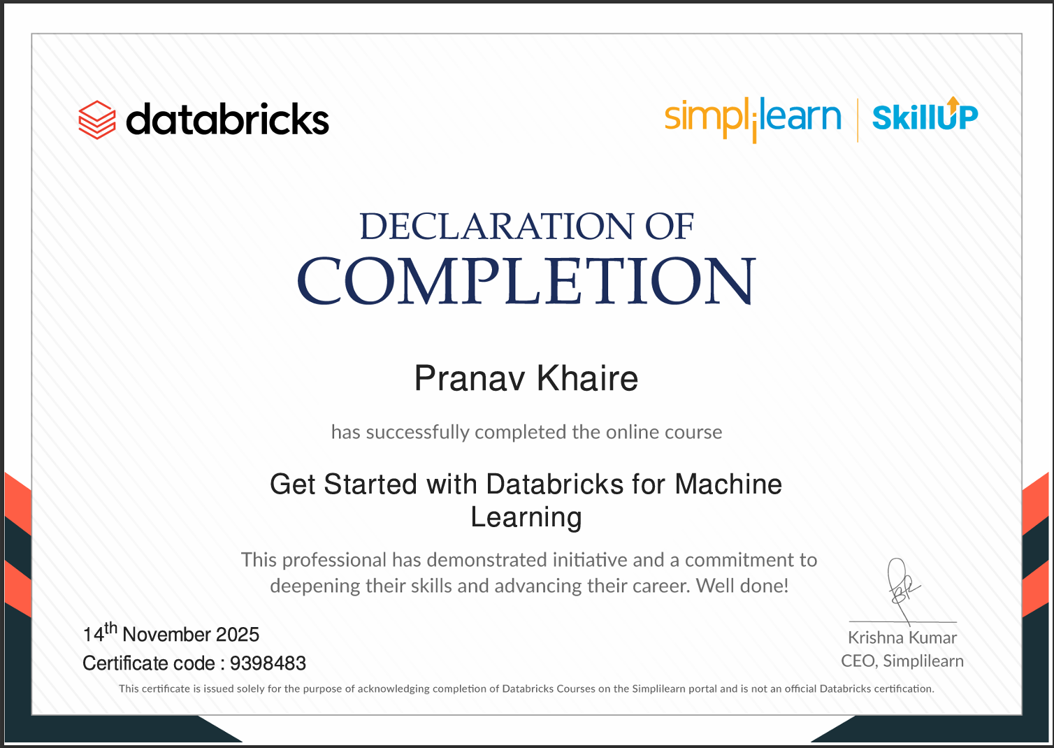 This Declaration of Completion is awarded to Pranav Samadhan Khaire for successfully completing the Get Started with Databricks for Machine Learning course on Simplilearn SkillUp.