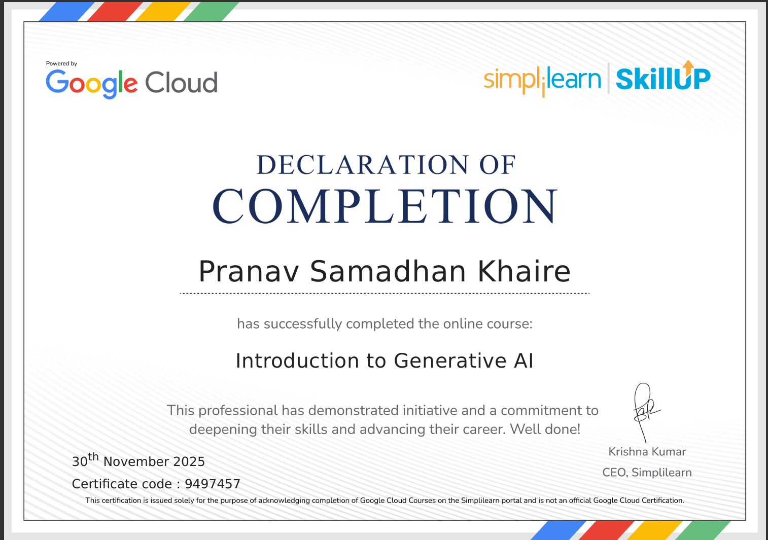 This Declaration of Completion is awarded to Pranav Samadhan Khaire for completing the Introduction to Generative AI course on Simplilearn SkillUp, powered by Google Cloud.