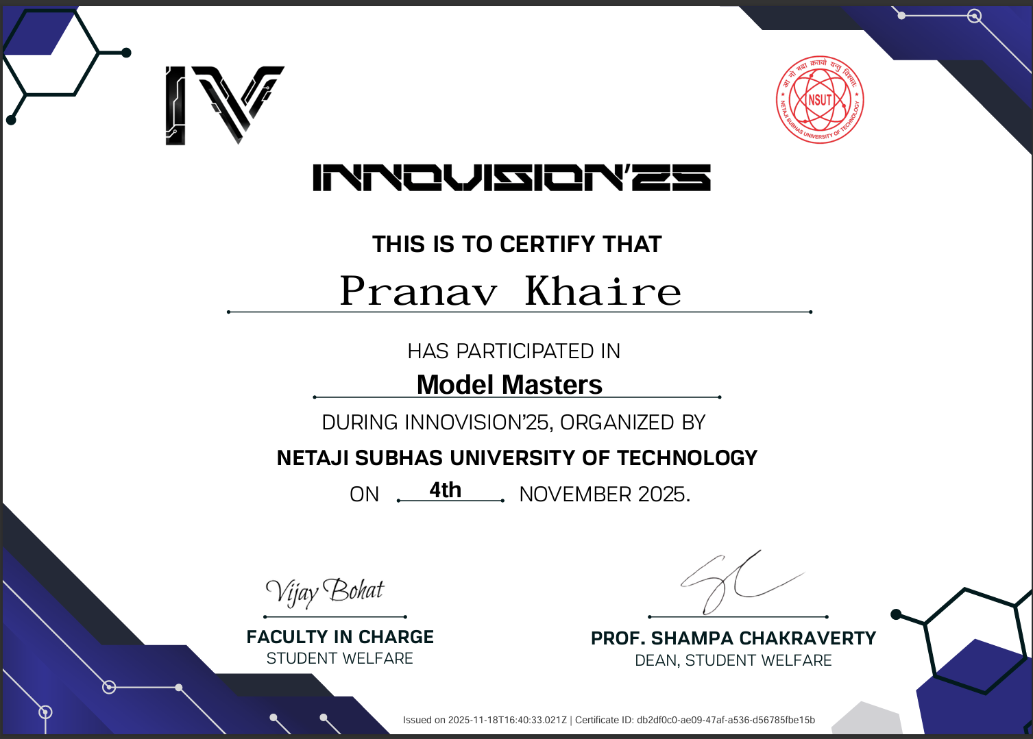 This Certificate of Participation is awarded to Pranav Khaire for taking part in Model Masters during Innovisionβ25 hosted by NSUT.