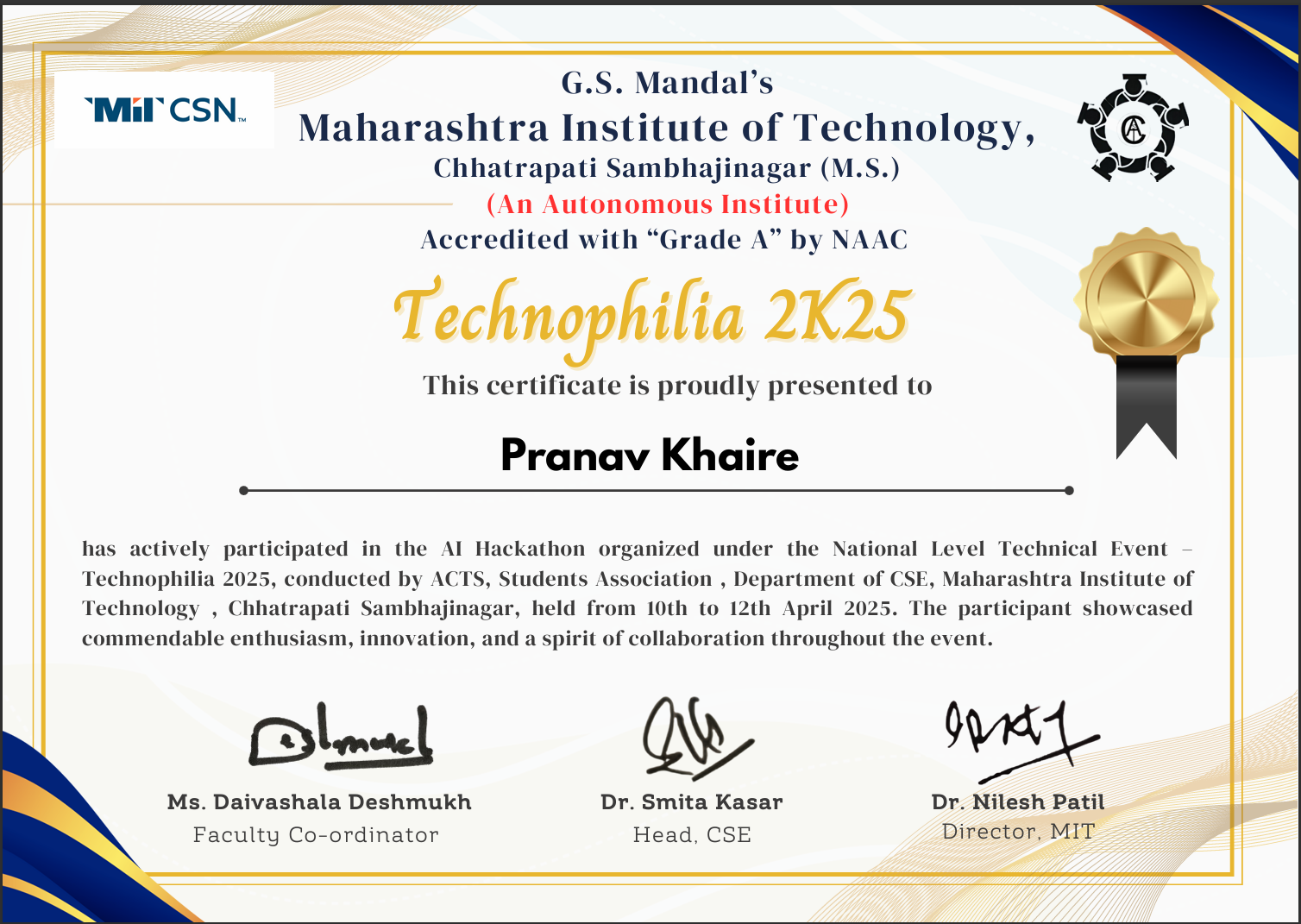 This certificate recognizes Pranav Samadhan Khaire for enthusiastic and innovative participation in the MIT AI Hackathon conducted during Technophilia 2k25. The event highlighted his teamwork, creativity, and capability to build AI-based solutions.