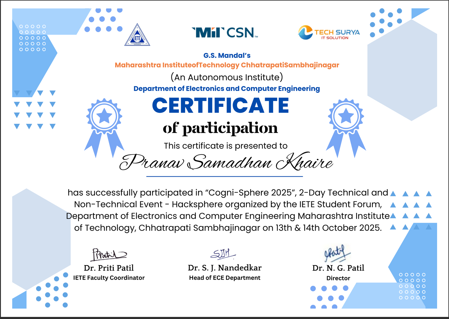 This Certificate of Achievement is formally awarded to Pranav Khaire for securing the First Rank in "Cogni-Sphere 2025", a 2-Day Technical & Non-Technical Project Competition organized by the IETE Student Forum, Department of Electronics and Computer Engineering, MIT Chhatrapati Sambhajinagar, held on 13β14 October 2025.