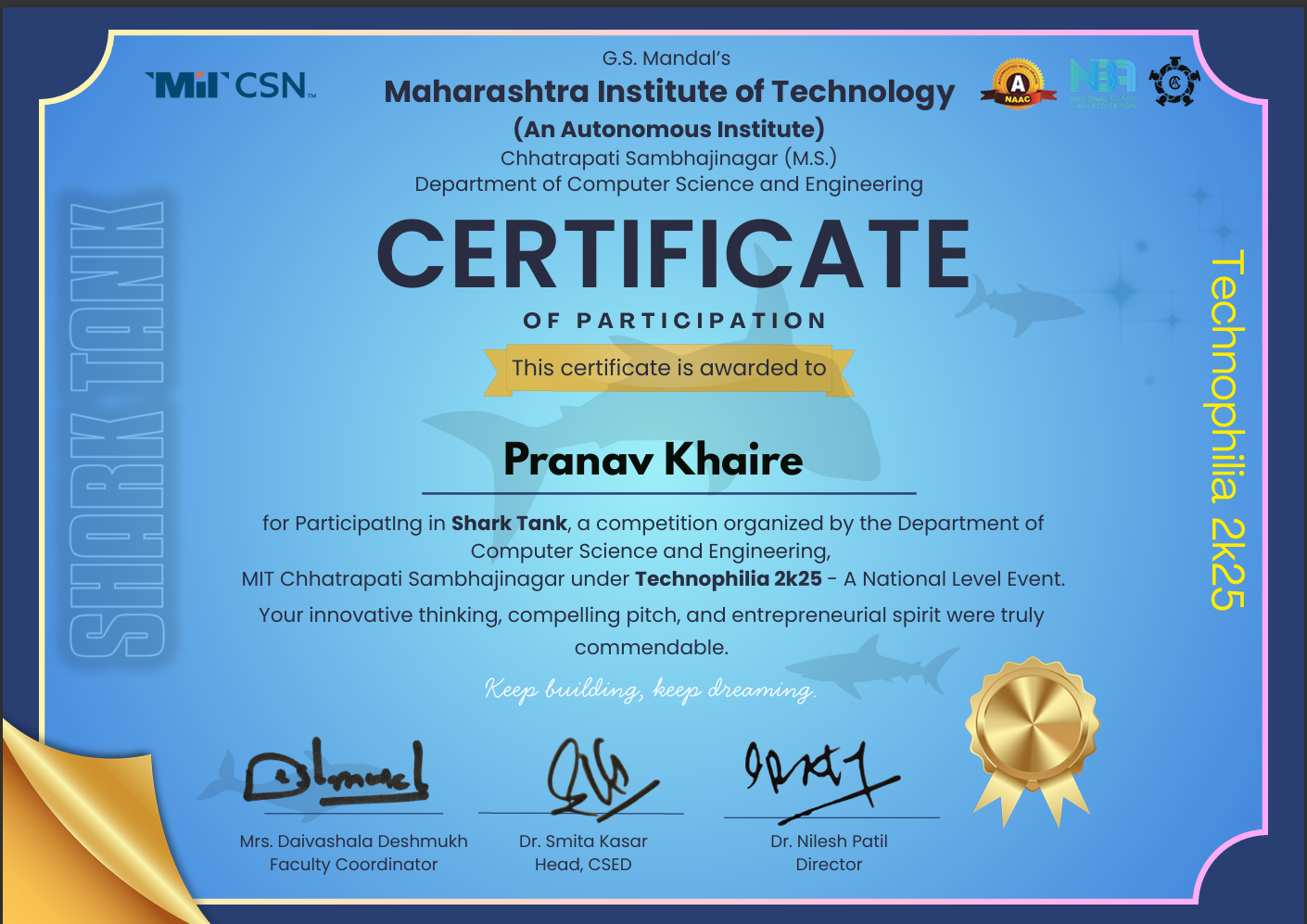 This Certificate of Participation is awarded to Pranav Samadhan Khaire for actively participating in the Shark Tank competition under Technophilia 2k25, showcasing innovative thinking, entrepreneurial pitching, and problem-solving abilities.